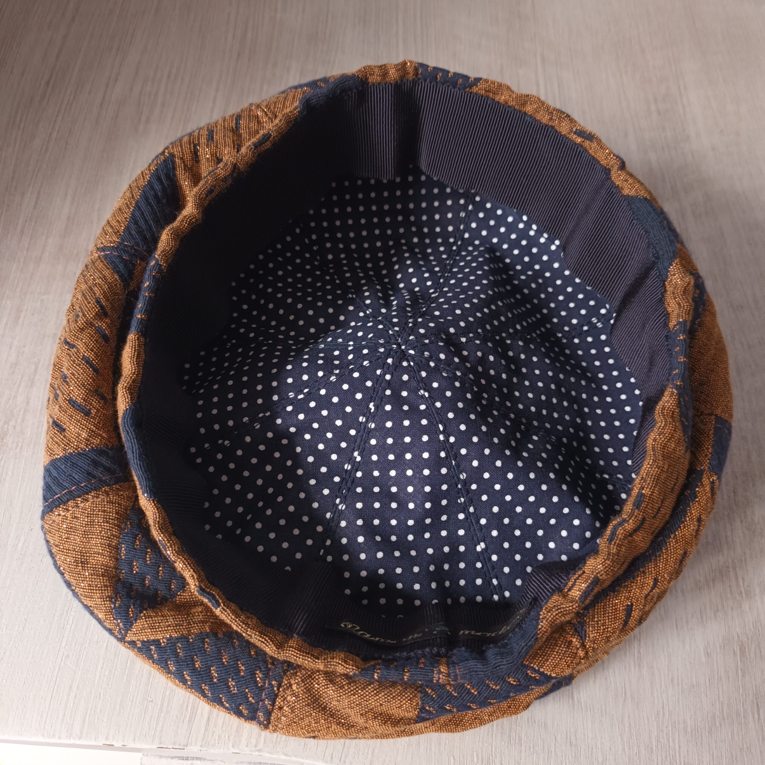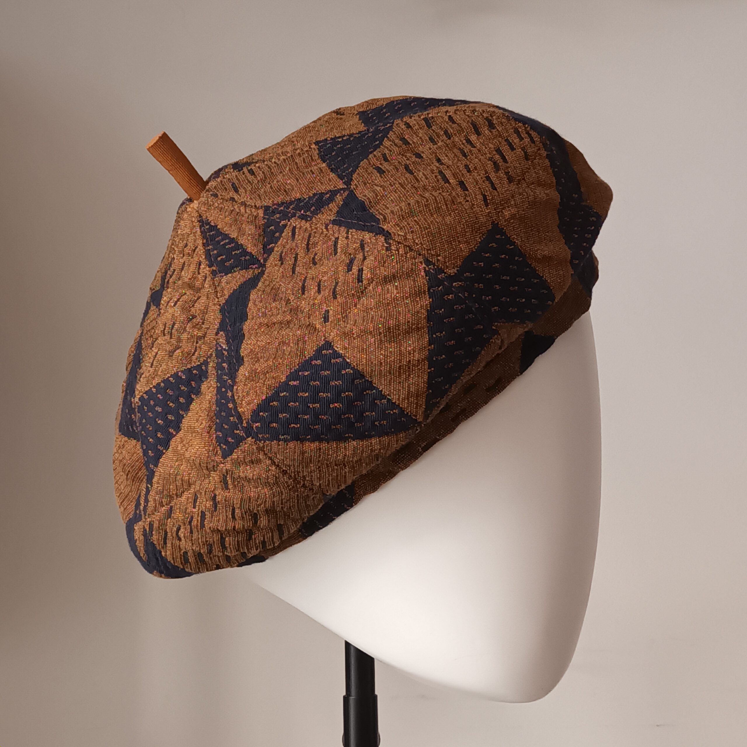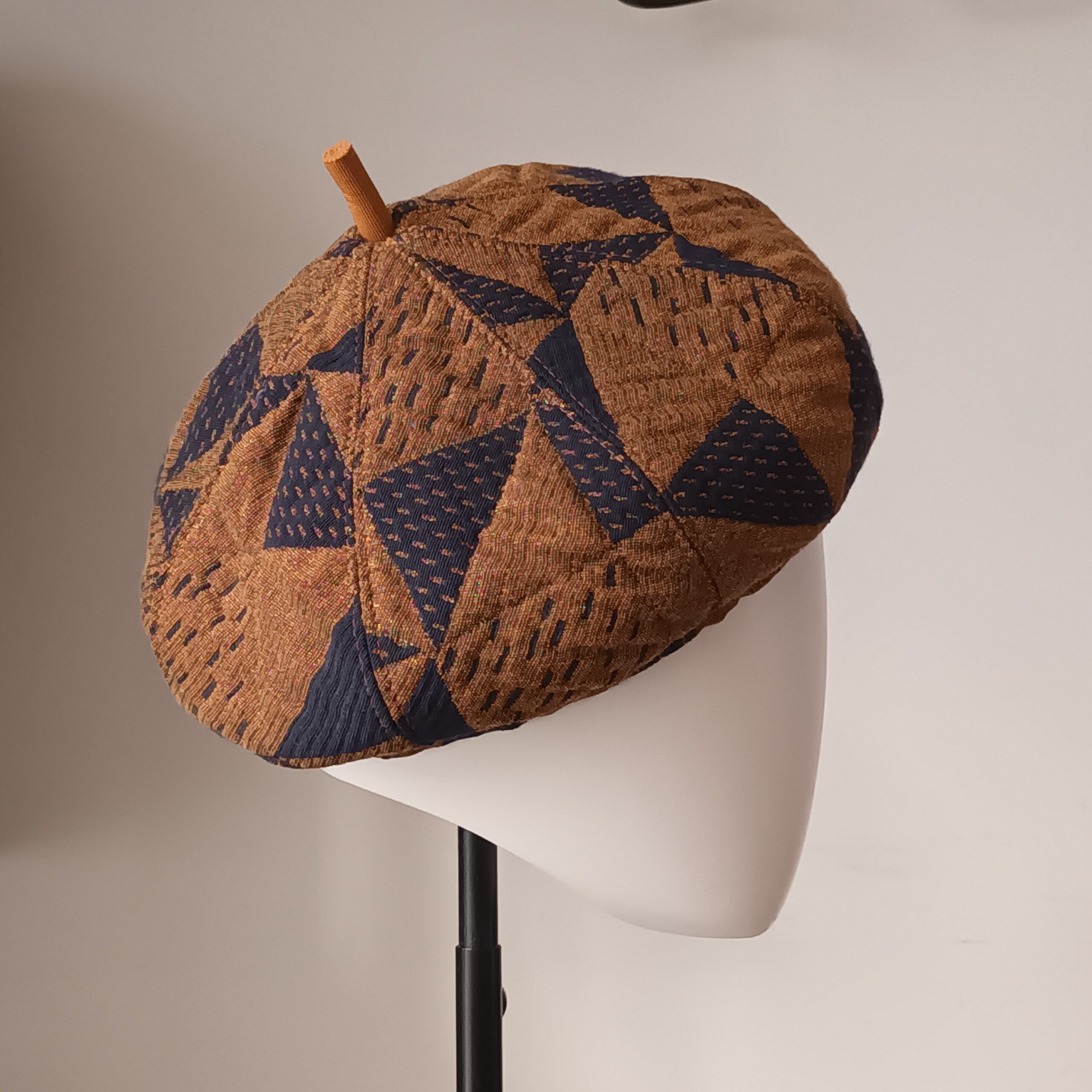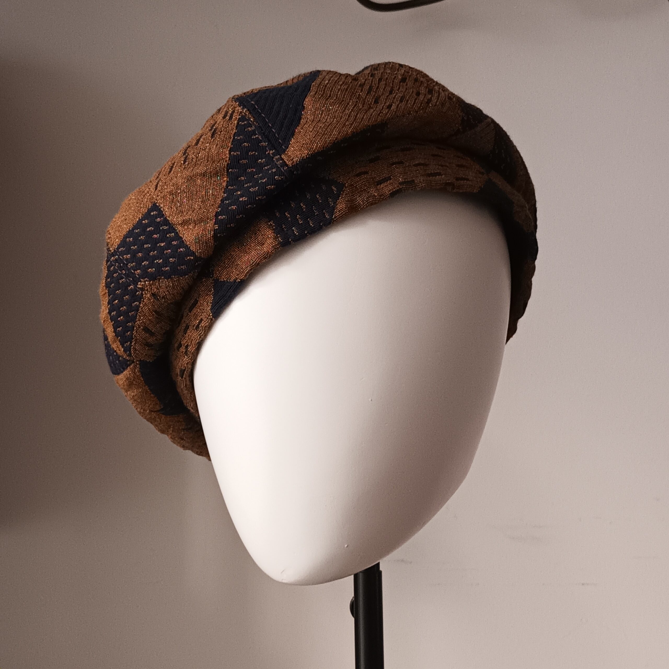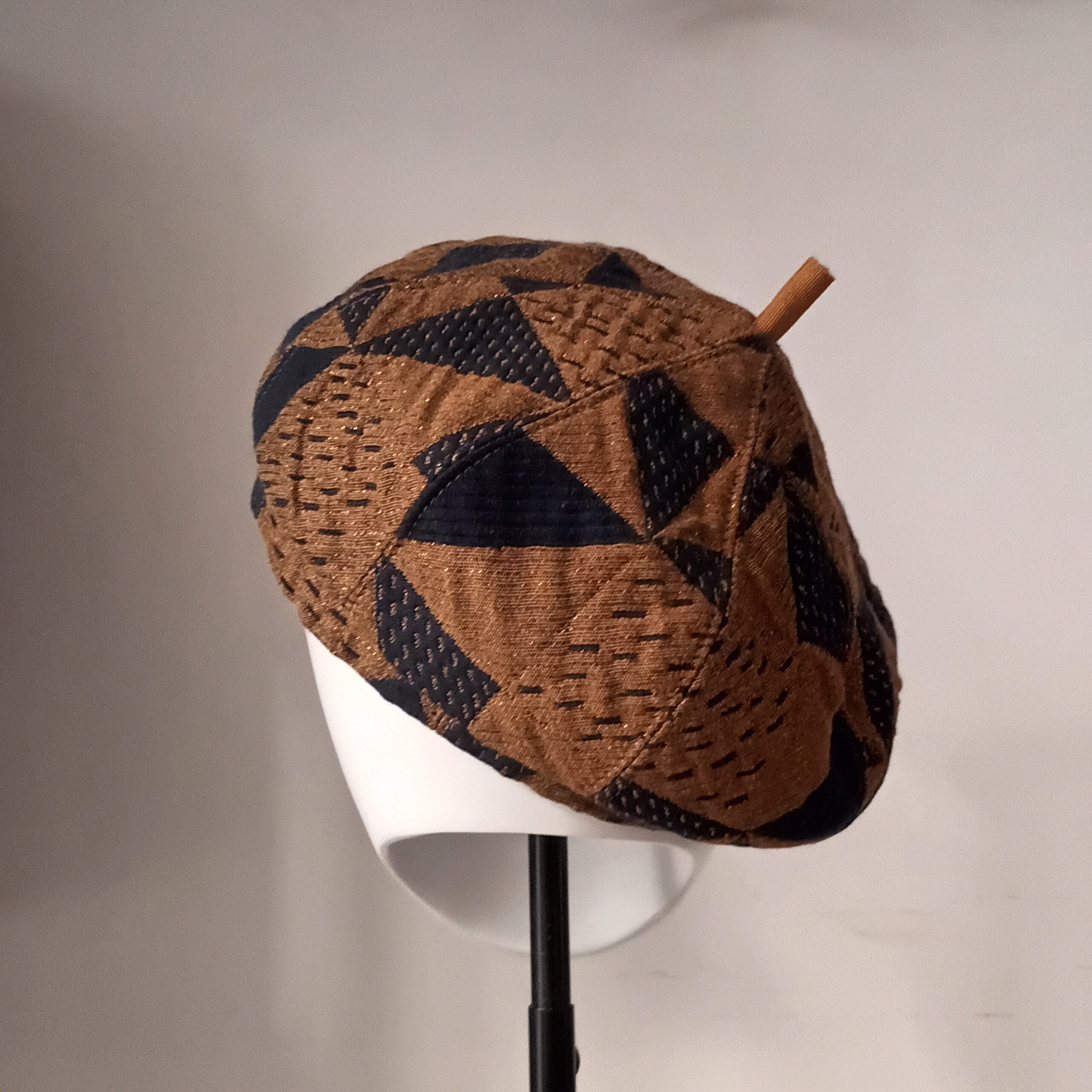 Apportez une touche d’élégance originale à votre tenue avec ce béret fantaisie à tranches en jacquard. Son motif géométrique décliné dans des tons camel et marine lui confère un style graphique chic et contemporain. Ce béret femme en jacquard est subtilement illuminé par un fil lurex cuivré, apportant de délicats reflets métallisés pour une allure sophistiquée. Le modèle est surmonté d’une “cigarette” en gros grain roulé coloris camel, clin d’œil raffiné au béret traditionnel revisité avec modernité. Confectionné avec soin, ce béret original et tendance est entièrement doublé de coton doux, assurant confort et tenue tout au long de la journée. Idéal pour accessoiriser un look automnal ou hivernal, ce béret géométrique camel et marine est un accessoire de mode unique qui marie savoir-faire et créativité. Portez-le avec un manteau en laine ou une veste en cuir pour un style urbain affirmé et élégant.